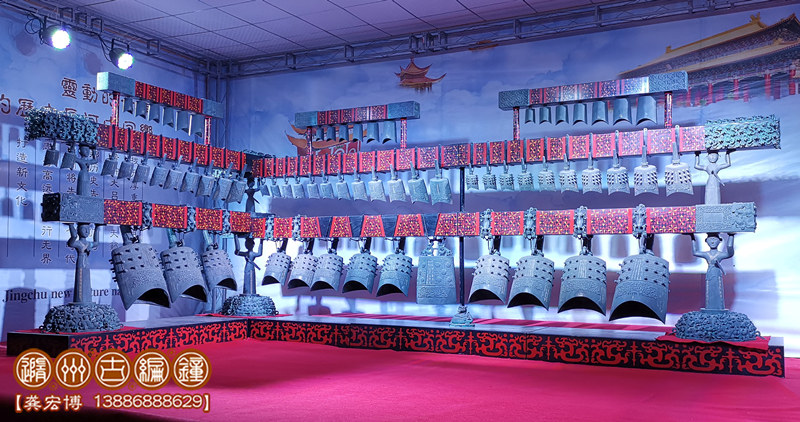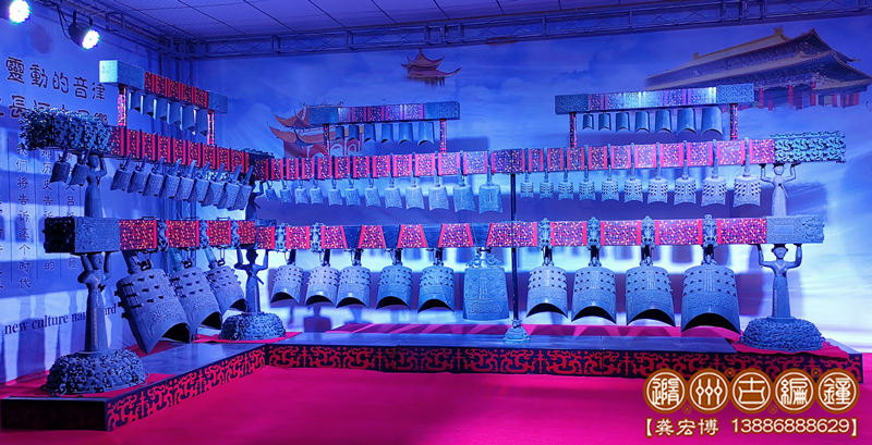 技術(shù)標(biāo)準(zhǔn):鑄件要求紋飾清晰,表面光潔,無裂、刺、孔、糙等鑄造缺陷;整套編鐘音域5個八度,一鐘雙音,按國際標(biāo)準(zhǔn)A=440Hz調(diào)音,音準(zhǔn)控制在±5Hz內(nèi),音色統(tǒng)一協(xié)調(diào),無雜、啞音響。其中下層13件為倍低音甬鐘,在演奏中起到烘托氣氛的作用,中層33件為中音域甬鐘,十二半音齊備,主要用于演奏主旋律,上層19件為被高音鐘和補(bǔ)音鐘,也是重要的半音和補(bǔ)充被高音音域,3組設(shè)計可以用于演奏復(fù)試旋律。其結(jié)構(gòu)、配件、銘文等全部按照曾侯乙編鐘樣式仿制。