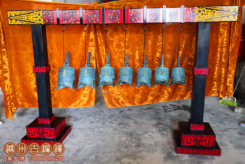 隨州古編鐘公司按客戶要求制作7件仿古編鐘,長(zhǎng)2.35米×寬0.45米×高1.5米。編鐘外形按照聞名世界的隨州曾侯乙編鐘仿制,編鐘為青銅鑄造;采用標(biāo)準(zhǔn)音音高A=440Hz調(diào)音1——7,要求聲音清脆悅耳,有延續(xù)音,無(wú)啞音編鐘,編鐘大梁采用優(yōu)質(zhì)板材制作,表面按設(shè)計(jì)噴漆,彩繪花紋,配套演奏木錘1把,包裝木箱。